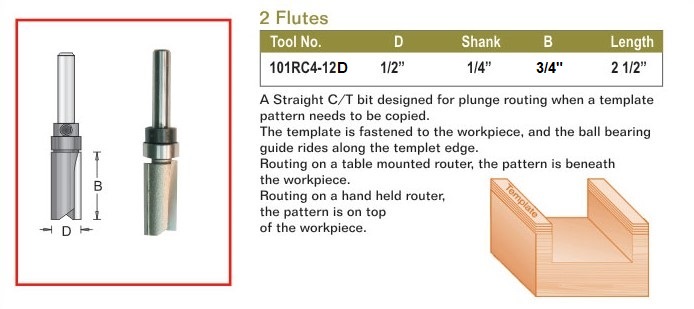 Template bits also known as Pattern bits or Straight Bits with Centre Ball Bearing are used in woodworking to replicate letters, shapes or designs by means of copying an overlaid shape onto the desired material. The Ball Bearing guide will ride along the Template, and the carbide teeth will cut into the material at the exact diameter of the bearing, hereby copying the design flush with the bearings diameter.