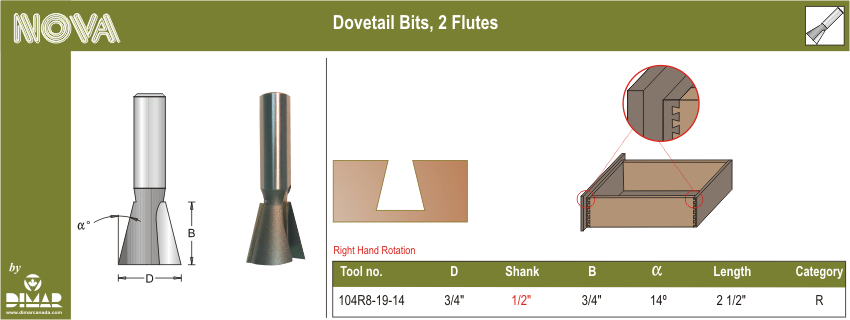 Dovetail Bits, Left Hand, 2 Flutes 1/2″ Dia. x 1/2″ Shank