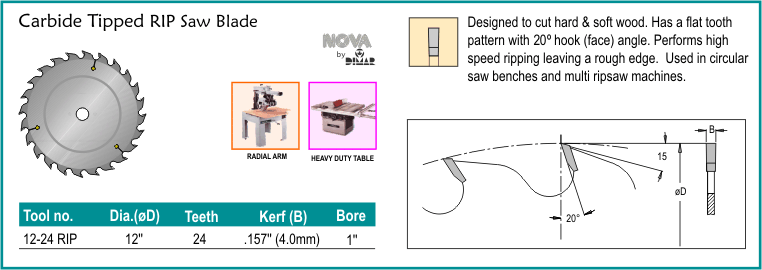 Carbide Tipped Ripping Blade 12″ x 24 teeth x 1″ bore. Designed to cut hard & soft wood. Has a flat tooth pattern with 20 hook (face) angle. Performs high speed ripping leaving a rough edge. Used in circular saw benches and multi ripsaw machines.