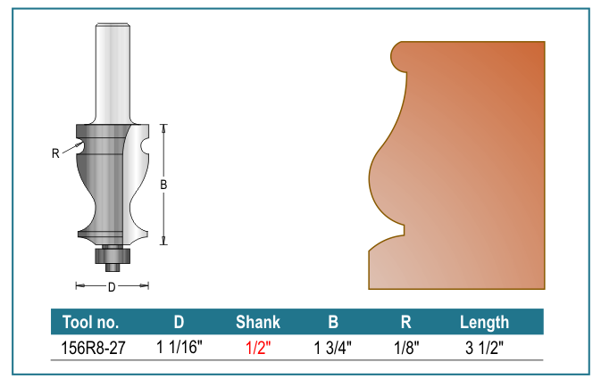 Fancy Moulding Bit Carbide Tipped 2 Flutes 1 1/16″ Dia. 1/2″ Shank 1 3/4″ Cut 1/8″ Radius 3 1/2″ Length
