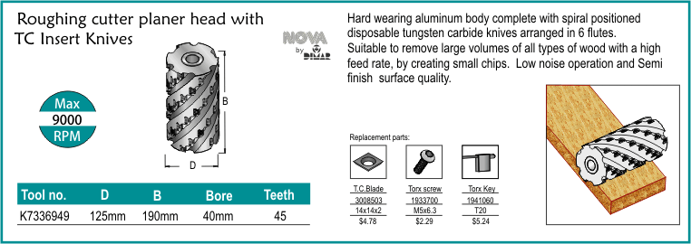 Roughing Cutter Head 125mm x 190mm. Hard wearing aluminum body complete with spiral positioned disposable TC Knives arranged in 6 flutes. Suitable to remove large volumes of all types of wood with a high feed rate.
