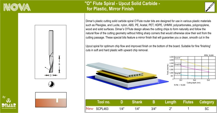 Dimar’s plastic cutting solid carbide spiral O Flute router bits are designed for use in various plastic materials such as Plexiglas, Lucite, nylon, ABS, PE, Acetal, PET, HDPE, UHMW, polycarbonates, polypropylene, wood and solid surfaces. Dimar’s O Flute design allows the cutting chips to form naturally and follow the natural flow of the cutting geometry without hitting sharp corners that would otherwise slow their exit from the cutting passage. These special bits feature a mirror finish that will guarantee you a clean, smooth cut in the most difficult acrylic materials. Designed for use in most CNC machines. 1/4″ Diameter 1/4″ Shank 3/4″ Cut 2″ Length