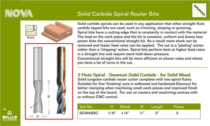 Solid Carbide Spiral Downcut, 2 Flute for Solid Wood. Solid tungsten carbide router cutter complete with two spiral flutes. Suitable for fine ‘finishing’ cuts in softwood and hardwood. Downcut for better clamping when machining small work pieces and improved finish on the top of the board. For use on routers and machining centers with or without CNC control.