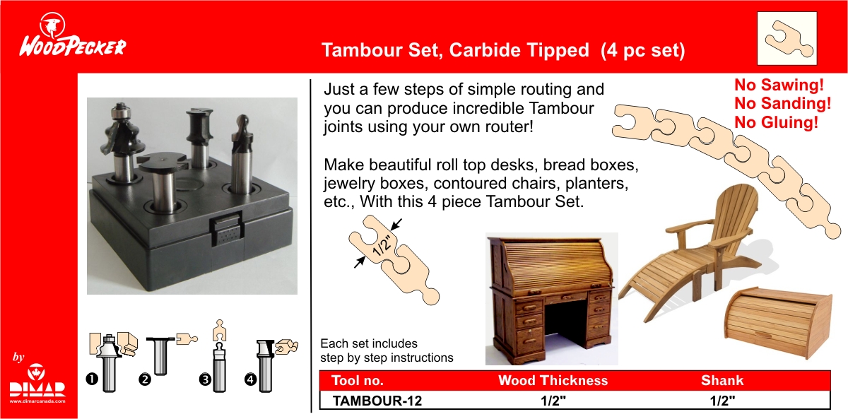 Make beautiful roll top desks, bread boxes, jewelry boxes, contoured chairs, planters, etc. with this 3 and 4 pieces Tambour Set. Just a few steps of simple routing and you can produce incredible Tambour joints using your own router!