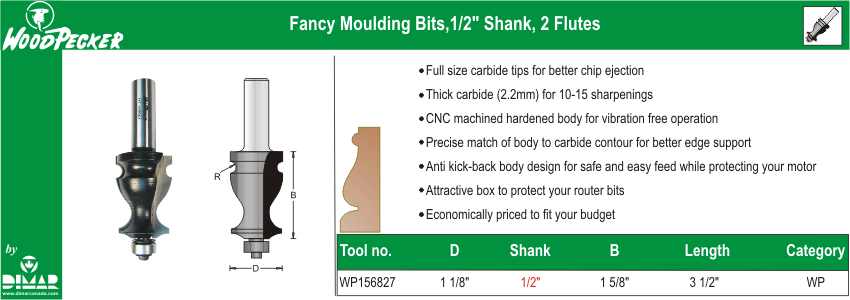 Moulding Bits, 2 Flutes 1 1/8″ Dia. 1/2″ Shank 3 1/2″ Length
