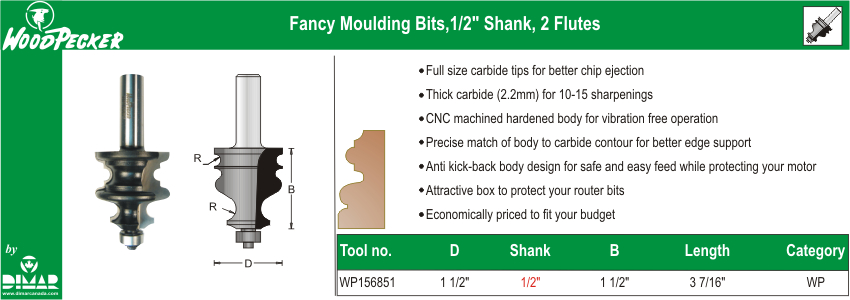 Moulding Bits, 2 Flutes 1 1/2″ Dia. 1/2″ Shank 3 7/16″ Length